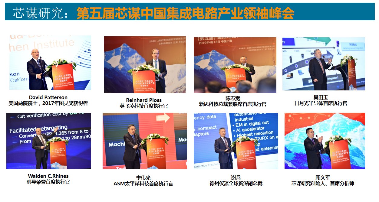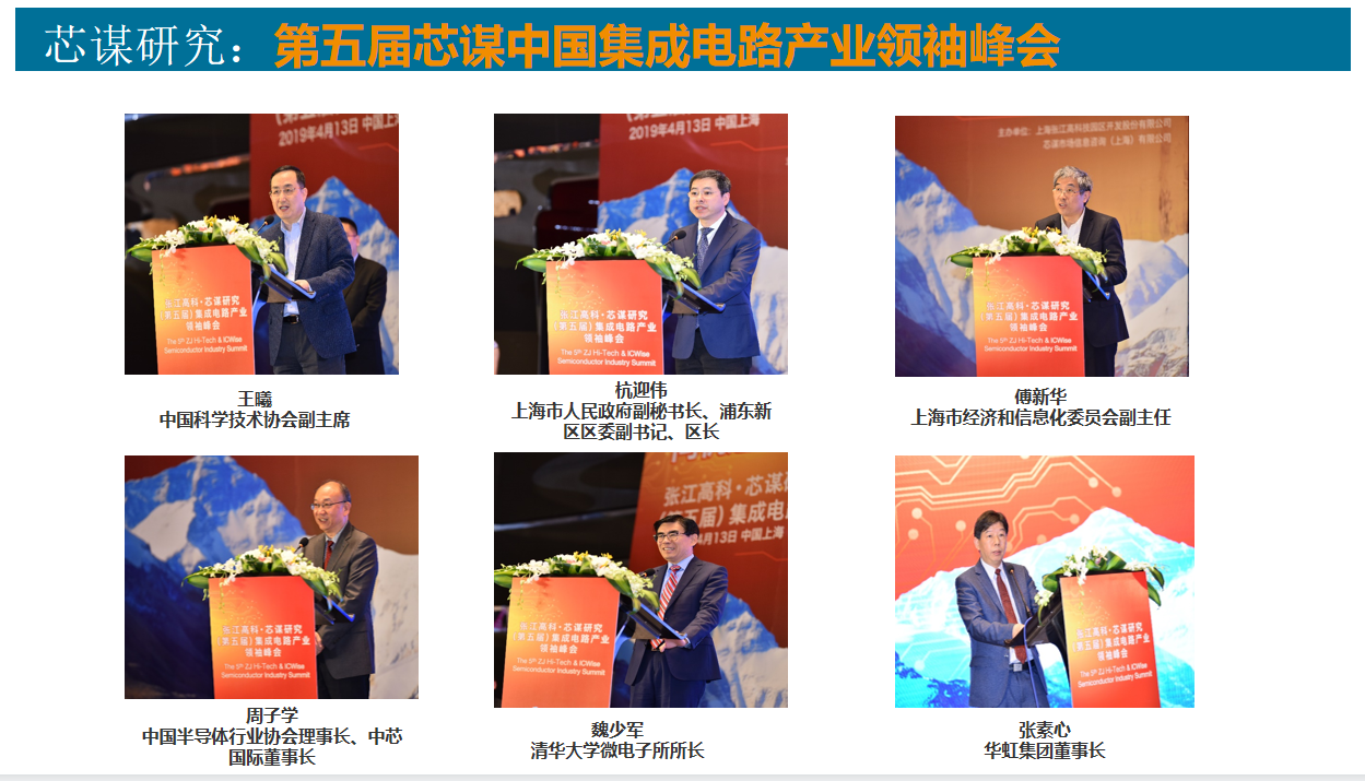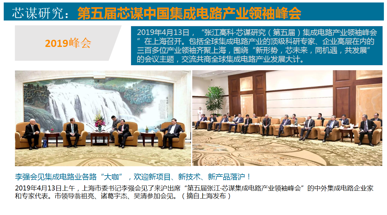 2019年4月13日,“張江高科·芯謀研究(第五屆)集成電路產業領袖峰會”在上海召開。包括全球集成電路產業的頂級科研專家、企業高層在內的三百多位產業領袖齊聚上海,圍繞“新形勢,芯未來,同機遇,共發展”的會議主題,交流共商全球集成電路產業發展大計。2019年4月13日上午,上海市委書記李強會見了來滬出席“第五屆張江·芯謀集成電路產業領袖峰會”的中外集成電路企業家和專家代表。市領導翁祖亮、諸葛宇杰、吳清參加會見。