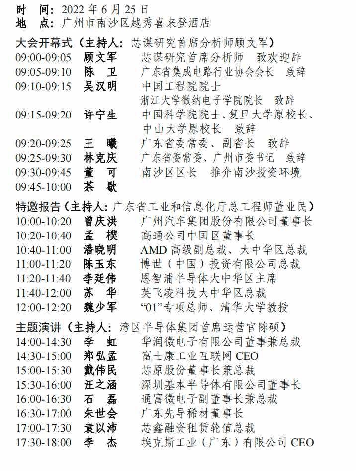 6月25日-26日,2022 中國·南沙國際集成電路產業論壇在廣州南沙召開。本次峰會由廣州南沙經濟技術開發區管理委員會、廣州市工業和信息化局主辦;支持單位為廣州灣區半導體產業集團有限公司、廣東省集成電路行業協會、廣州市半導體協會;廣東省半導體及集成電路集群智庫機構芯謀研究承辦。廣東省委常委、廣州市委書記林克慶,廣東省委常委、副省長王曦出席并致辭。此次峰會是芯謀研究第一次走出上海舉辦的兩天會議,得到了眾多業內老朋友的支持。我們感到非常榮幸,對大家的支持表示由衷的感謝!